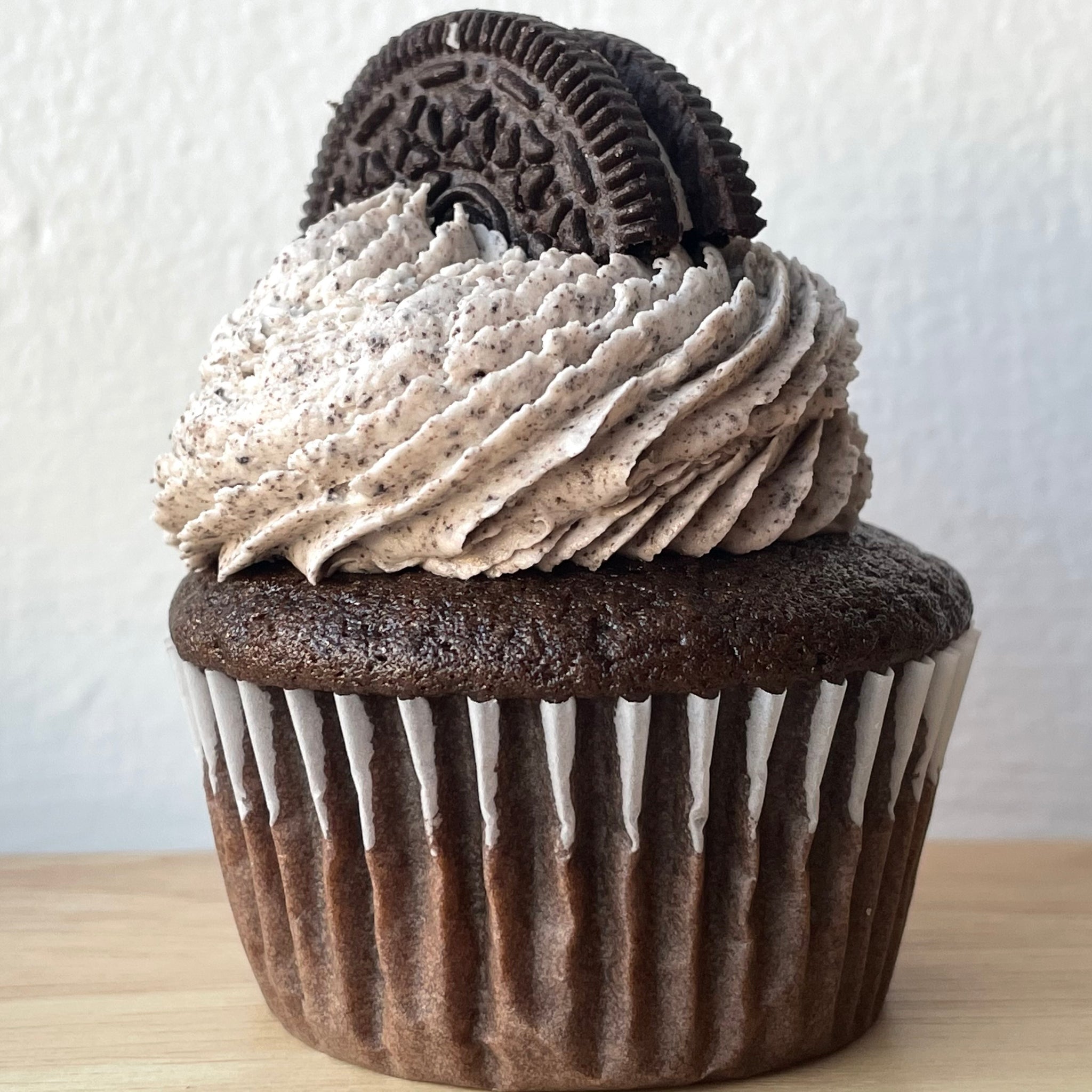 Decadent chocolate cupcake topped with Oreo buttercream and an Oreo cookie half!