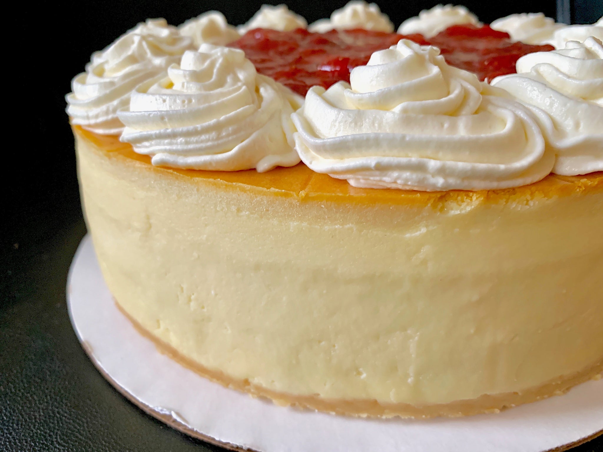Codetta Classic cheesecake topped with handmade strawberry compote and fresh whipped cream.